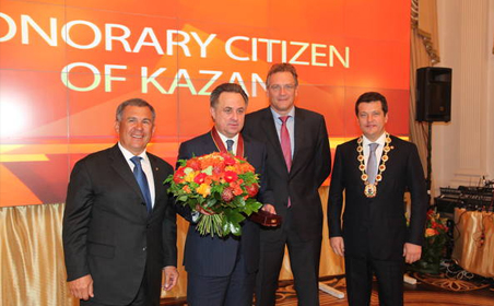 29.10.2013 Министр спорта России стал Почетным гражданином Казани Сегодня мэр столицы Татарстана Ильсур Метшин вручил министру спорта РФ Виталию Мутко знак Почетного гражданина Казани. Церемония, участие в которой принял Президент РТ Рустам Минниханов, состоялась в Казанской ратуше.