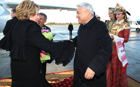 07.11.2013 В Казань прибыла Валентина Матвиенко Сегодня в Казань прибыла Председатель Совета Федерации Валентина Матвиенко. В международном аэропорту «Казань» ее встречали Президент Татарстана Рустам Минниханов, Председатель Государственного Совета РТ Фарид Мухаметшин и др.